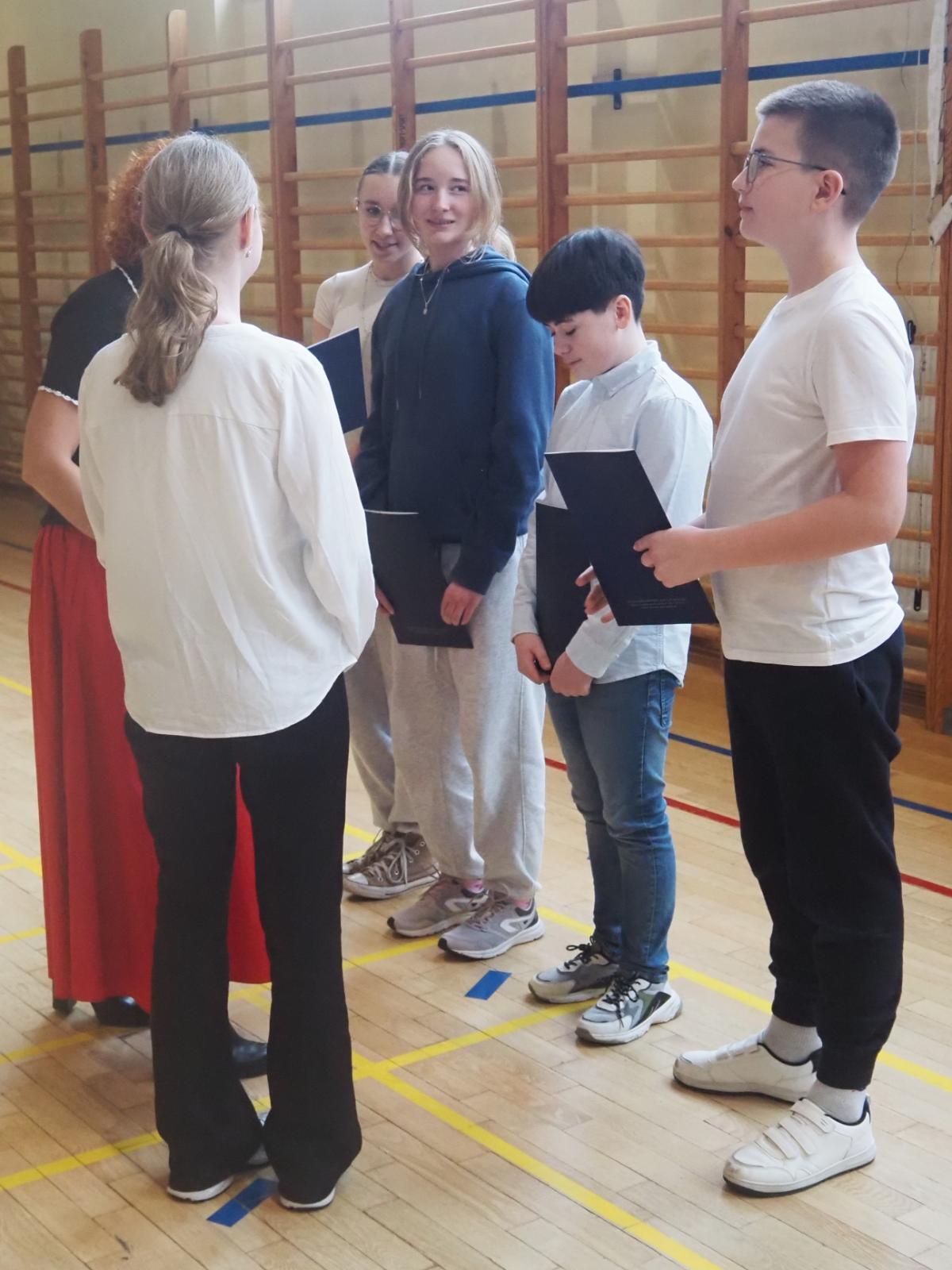 13.03.2025 r. Julia Pastuła, Anna Skoczylas, Emmanuel Szmist oraz Maksymilian Szpunar odebrali dyplomy oraz serdeczne gratulacje z rąk Pani Dyrektor Anny Adasiewicz, Pani Wicedyrektor Marzeny Mikulec oraz Przewodniczącej Samorządu Szkolnego Nikoli Wołowiec na uroczystej akademii szkolnej.