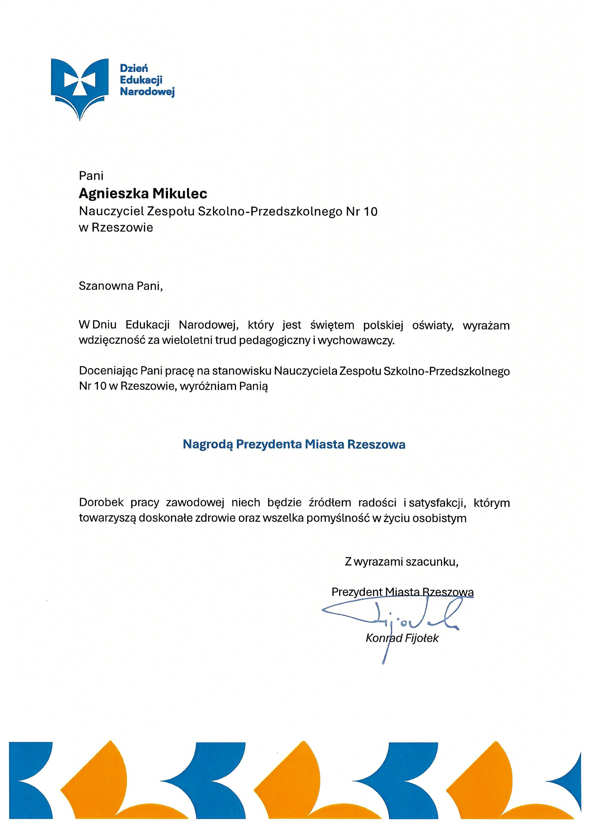 Jest nam niezwykle miło poinformować, że nasza nauczycielka Pani mgr Agnieszka Mikulec w święto Dnia Edukacji Narodowej otrzymała Nagrodę Prezydenta Miasta Rzeszowa. Pani Agnieszka została w ten sposób uhonorowana za wieloletni trud pedagogiczny i wychowawczy. To w pełni zasłużone uznanie dla zaangażowania w pełnienie codziennych obowiązków oraz nieustanne mobilizowanie uczniów do działania i rozwoju. Serdecznie gratulujemy i życzymy dalszych sukcesów.