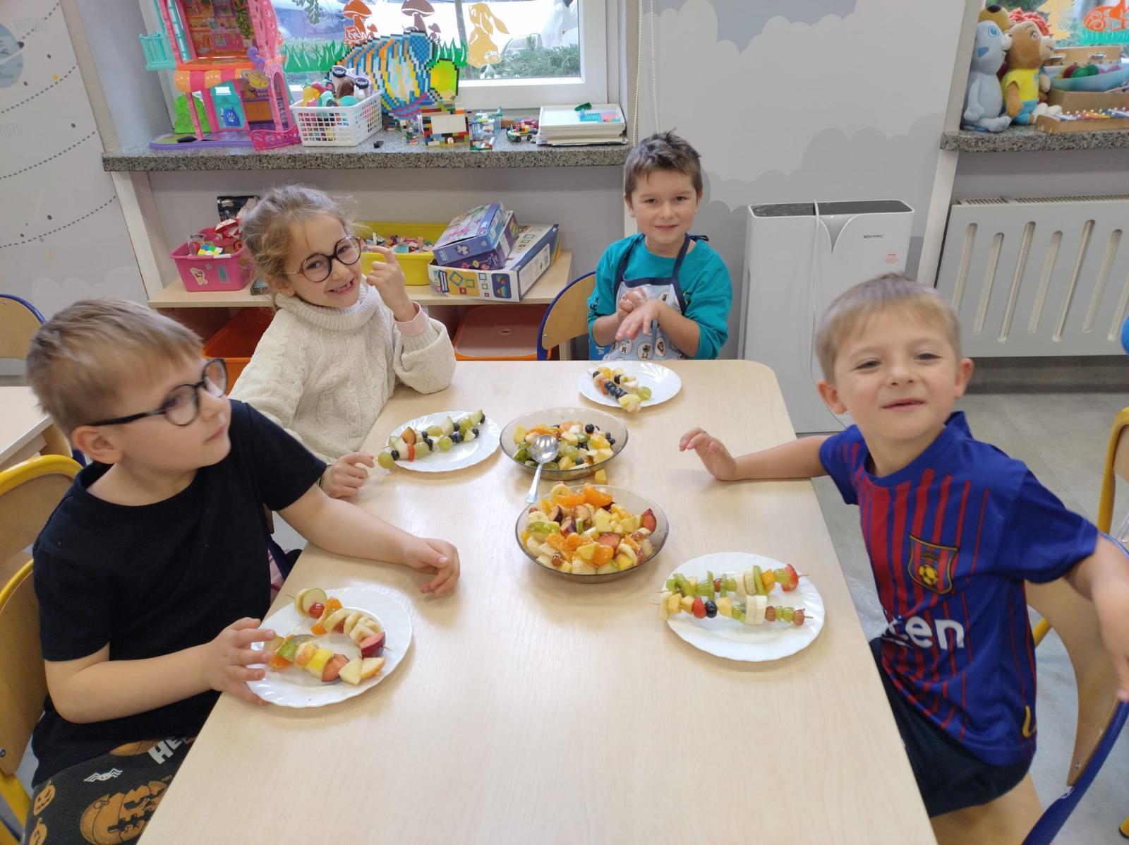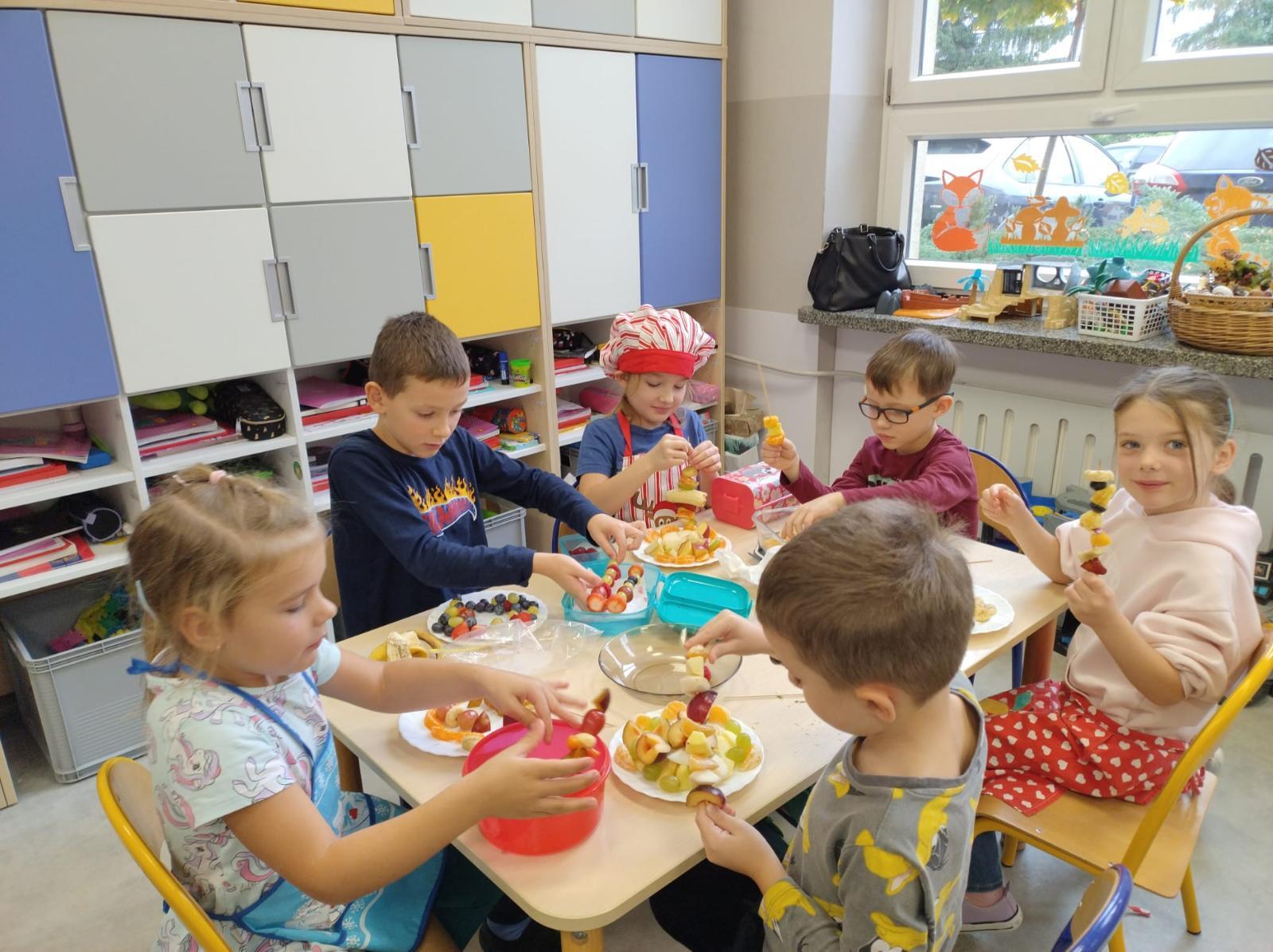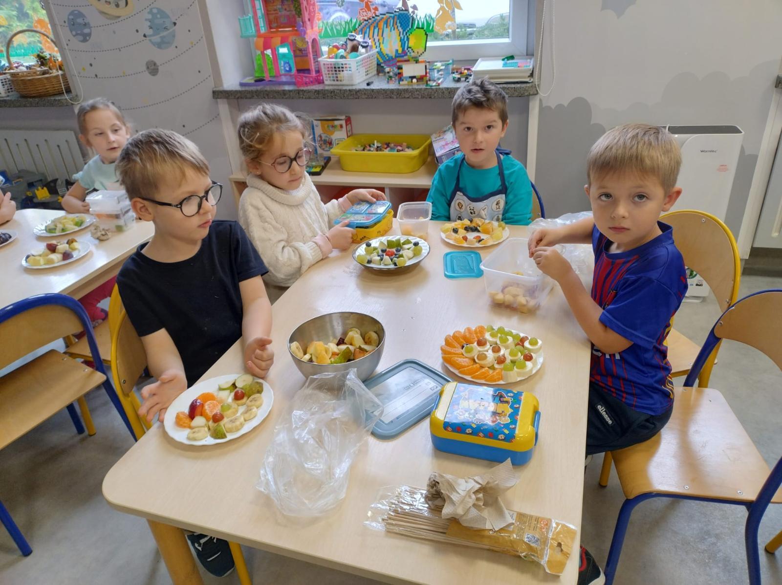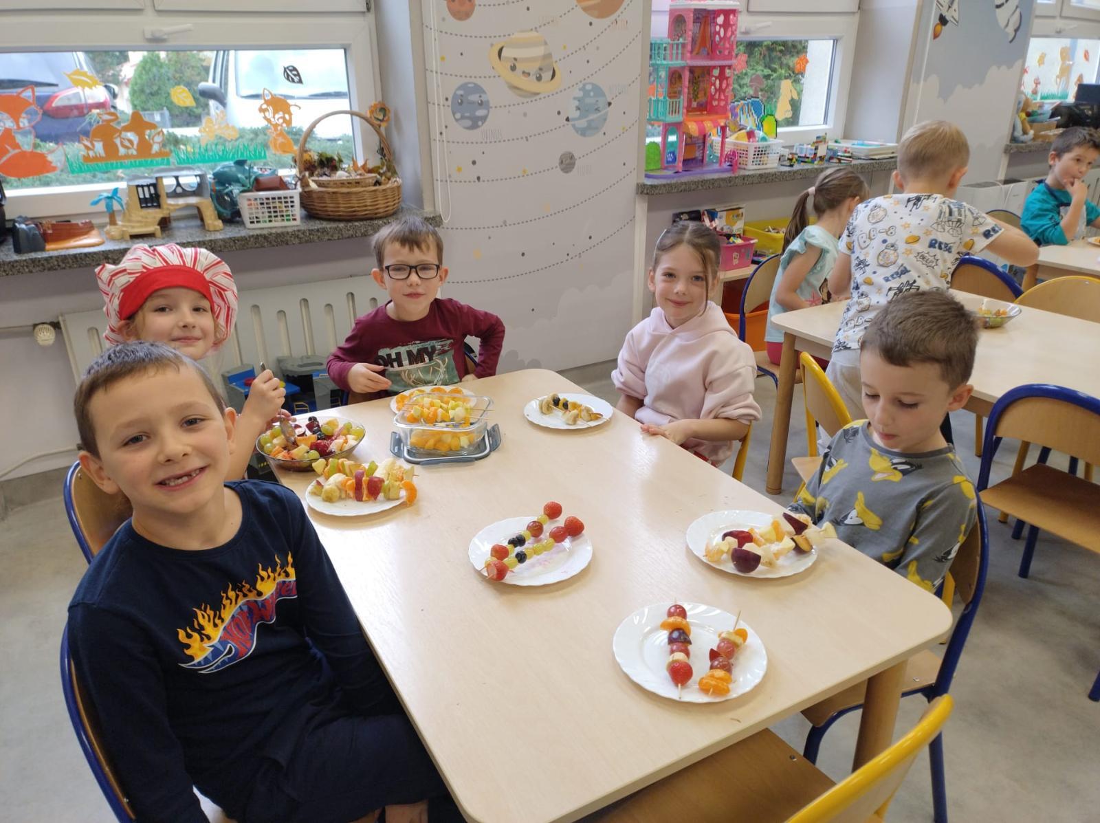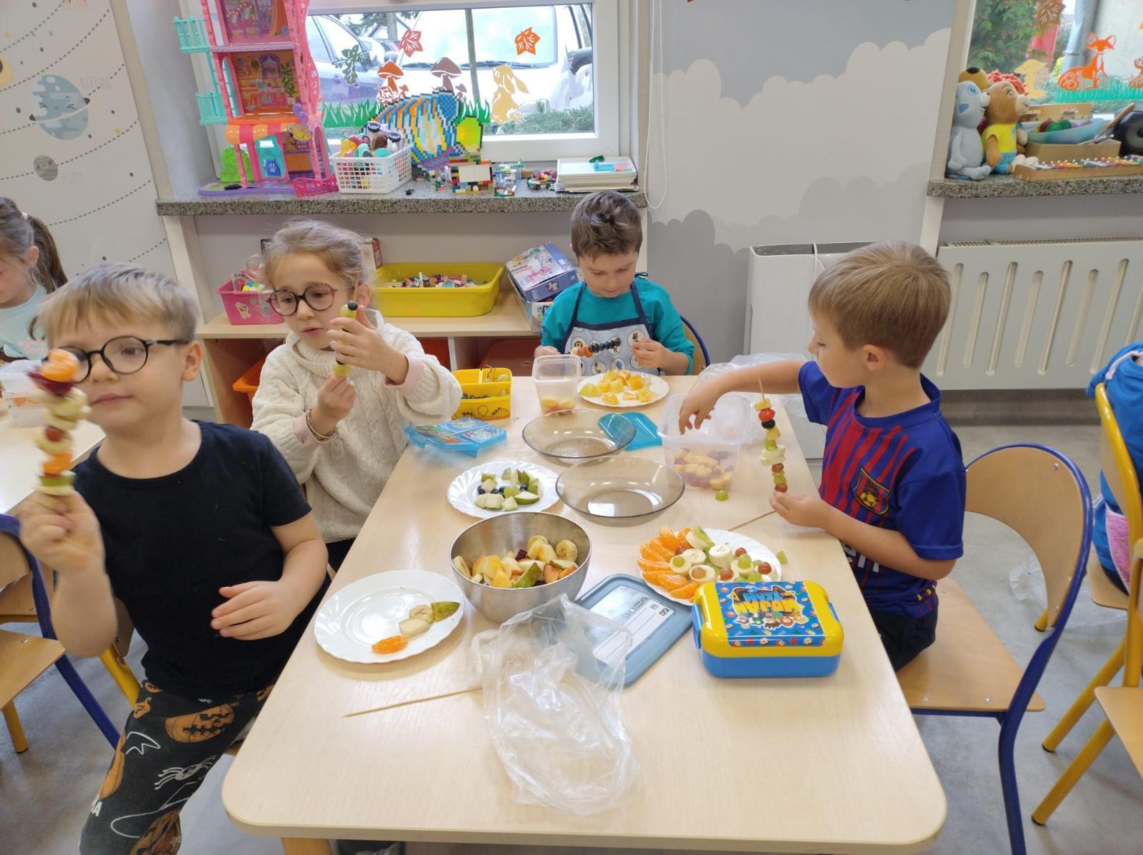 17 października najstarsze przedszkolaki przygotowywały szaszłyki owocowe oraz pyszną sałatkę z owoców. Wspólnie komponowały kolorowe przysmaki z jabłek, bananów, winogron, kiwi i innych ulubionych owoców. Podczas zajęć rozmawialiśmy o tym, dlaczego warto jeść owoce każdego dnia i jak pomagają nam zachować zdrowie i energię. Nie zabrakło też oczywiście degustacji – wszystko smakowało wyśmienicie!