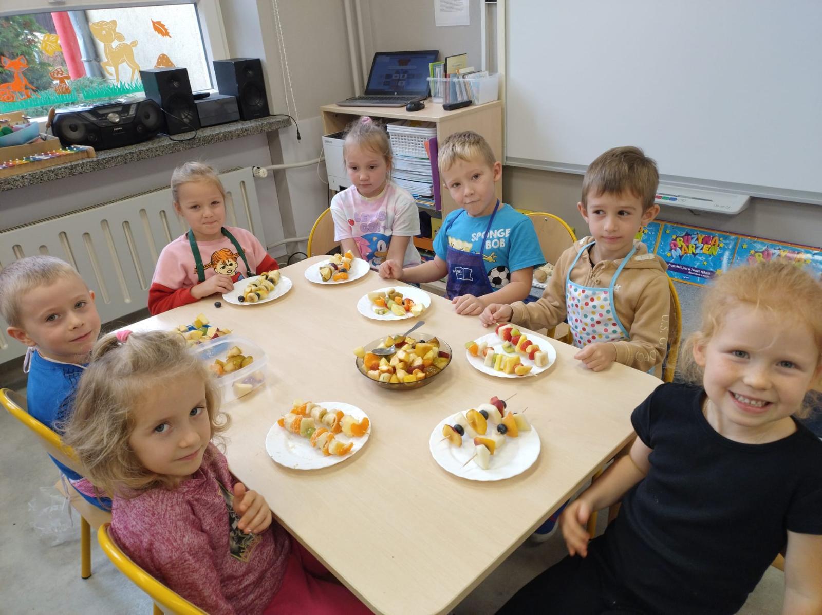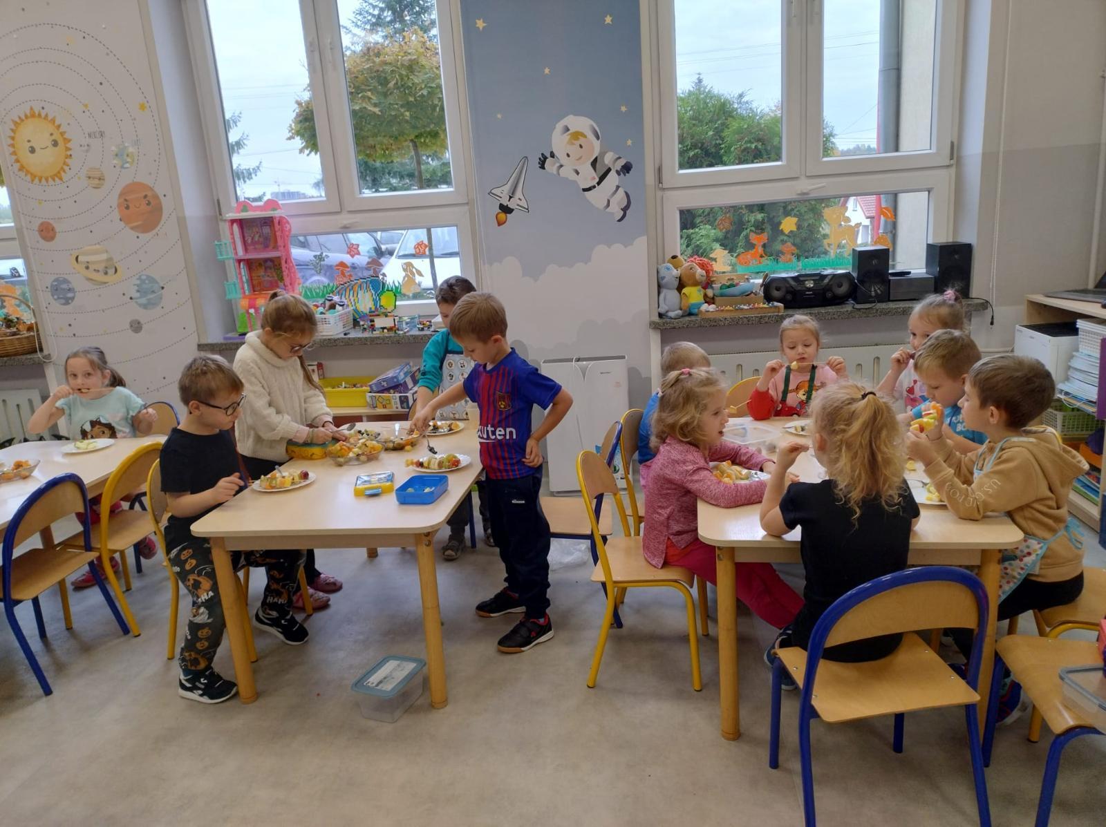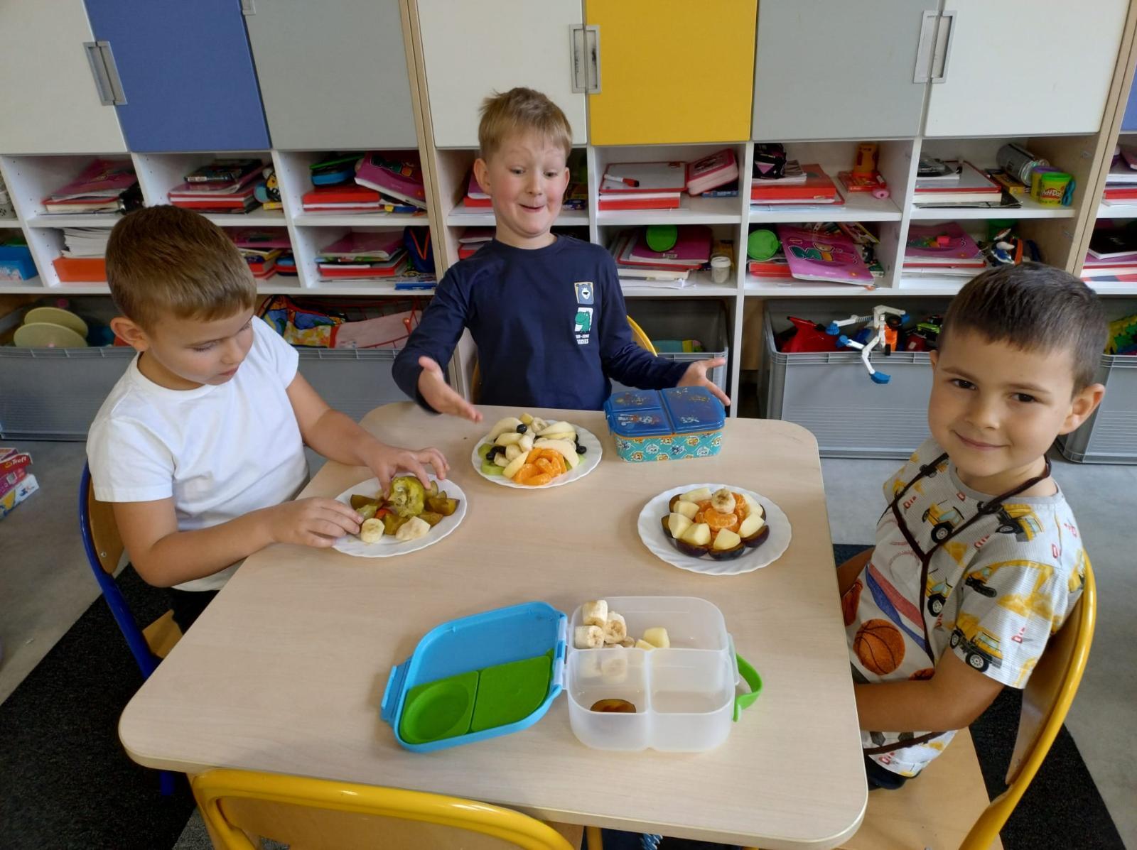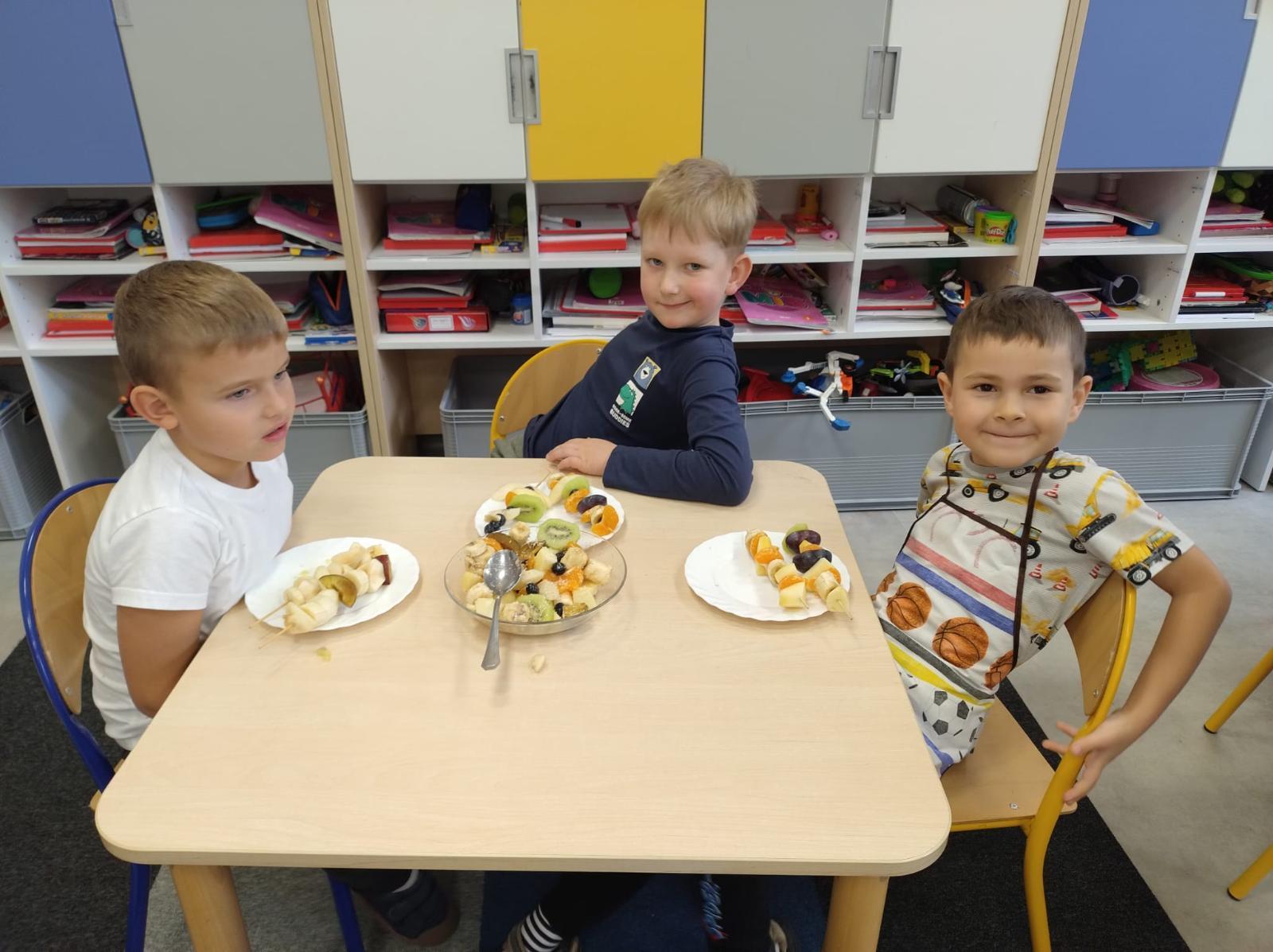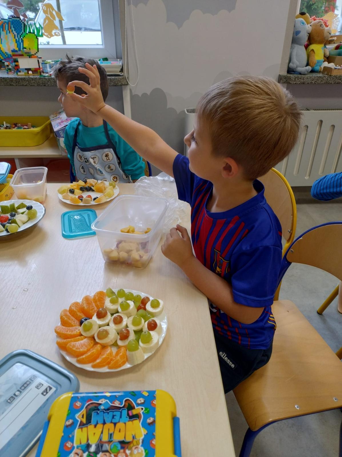 17 października najstarsze przedszkolaki przygotowywały szaszłyki owocowe oraz pyszną sałatkę z owoców. Wspólnie komponowały kolorowe przysmaki z jabłek, bananów, winogron, kiwi i innych ulubionych owoców. Podczas zajęć rozmawialiśmy o tym, dlaczego warto jeść owoce każdego dnia i jak pomagają nam zachować zdrowie i energię. Nie zabrakło też oczywiście degustacji – wszystko smakowało wyśmienicie!