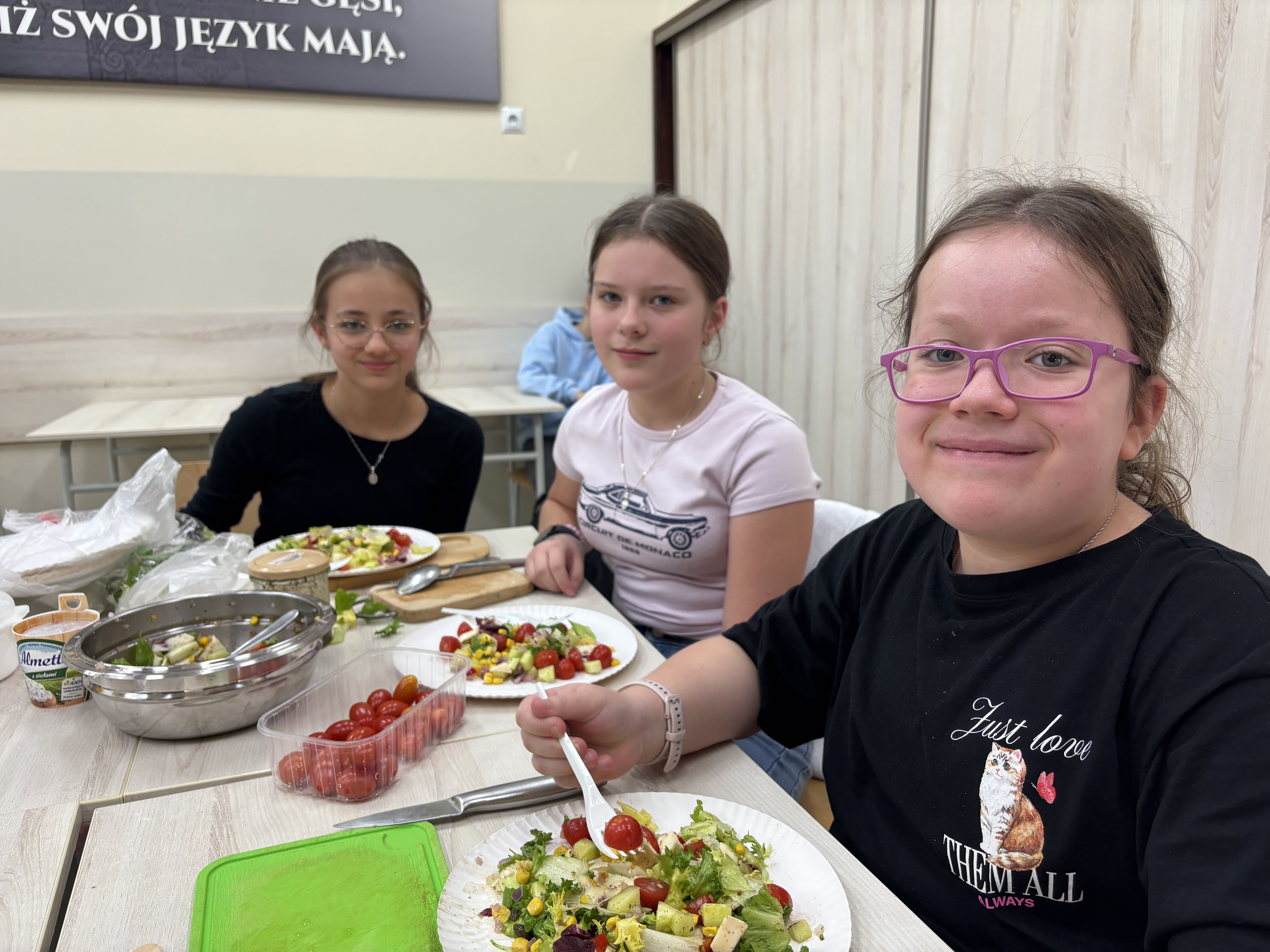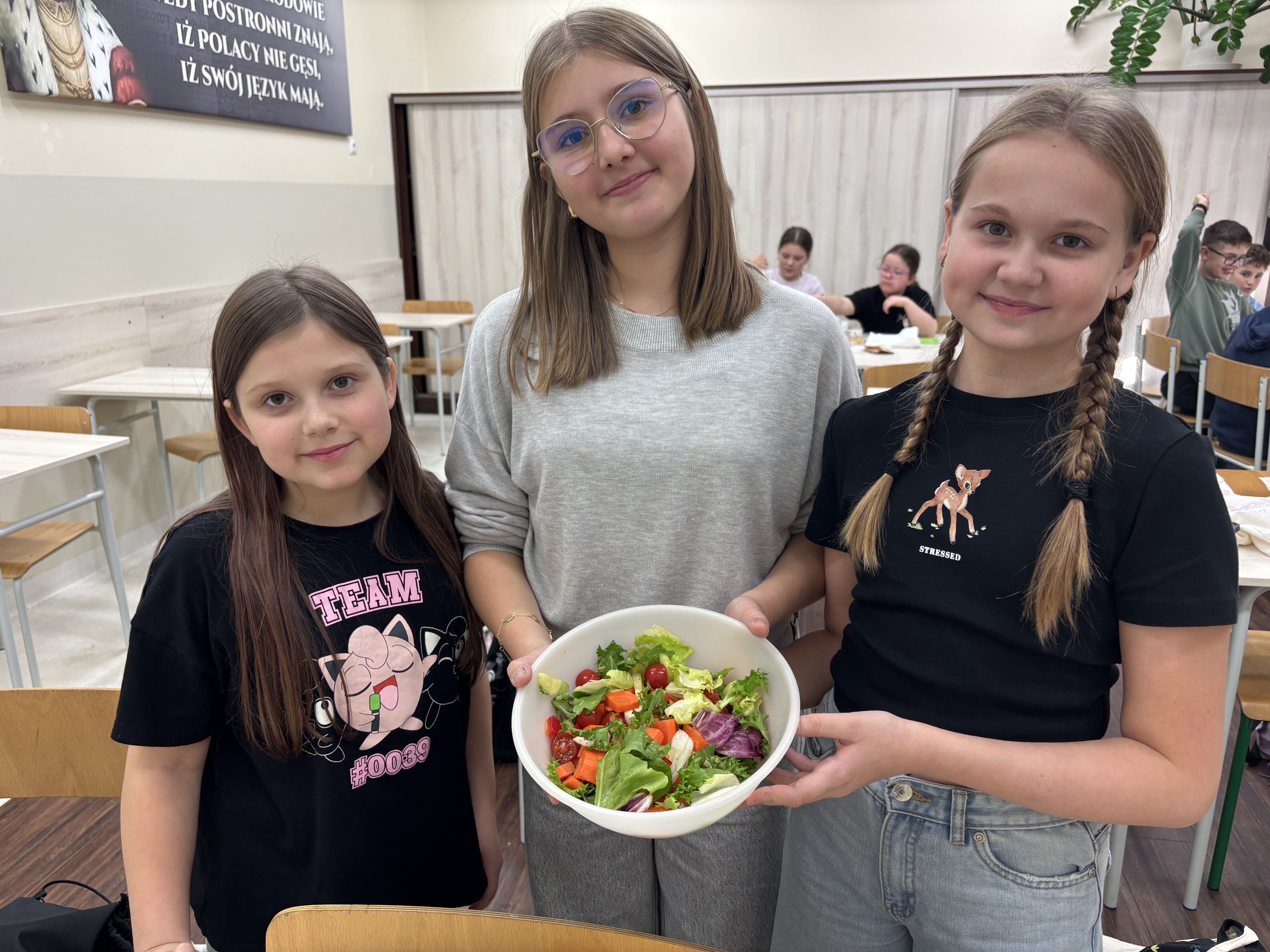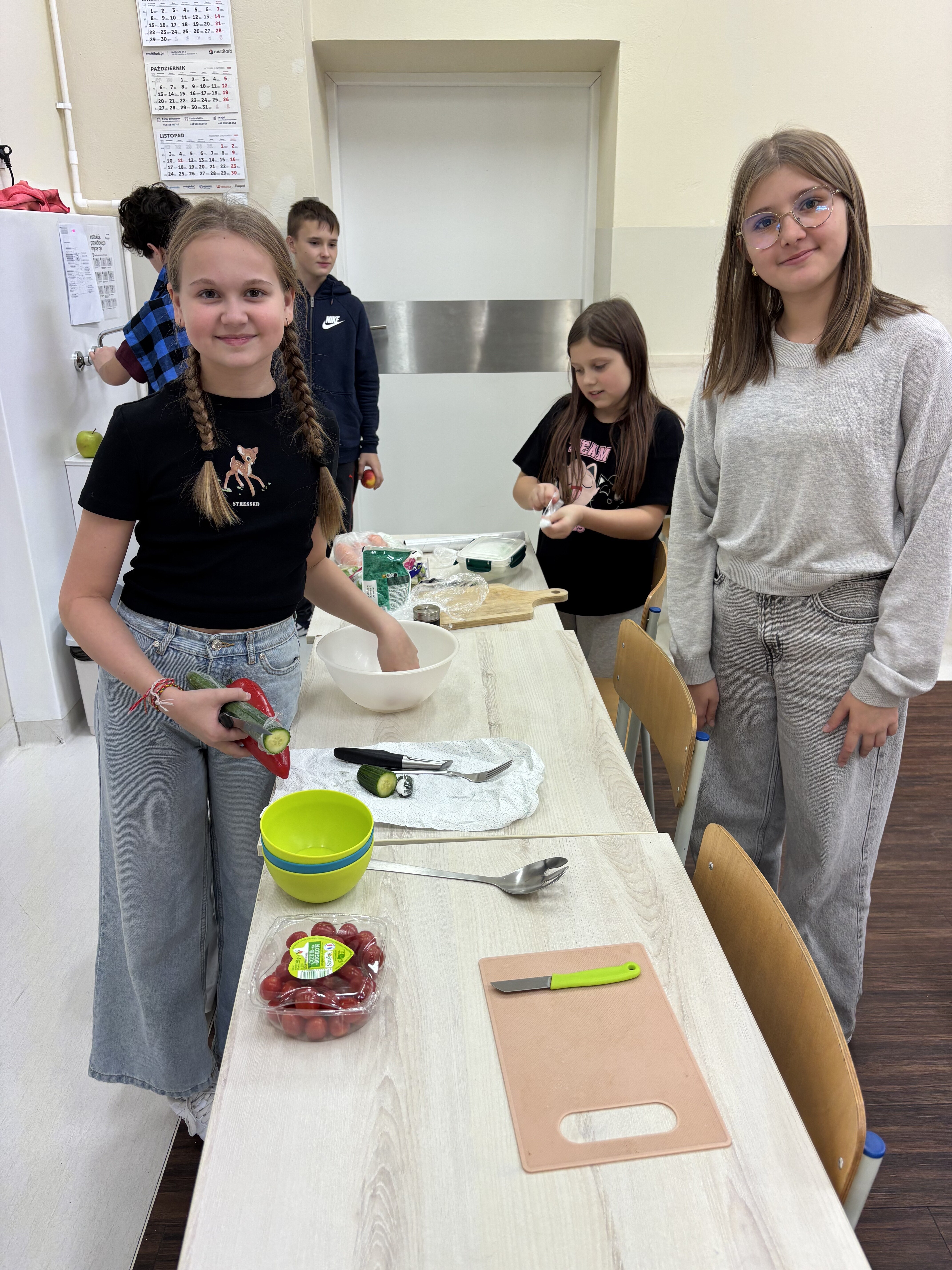 Podczas dzisiejszej lekcji uczniowie klasy 5b wzięli udział w wyjątkowych zajęciach poświęconych zdrowemu stylowi życia. Rozmawialiśmy o tym, jak ważne są ruch, aktywność fizyczna oraz zbilansowana dieta. Następnie przeszliśmy do części praktycznej – wspólnie przygotowaliśmy kolorowe, pełne witamin sałatki.