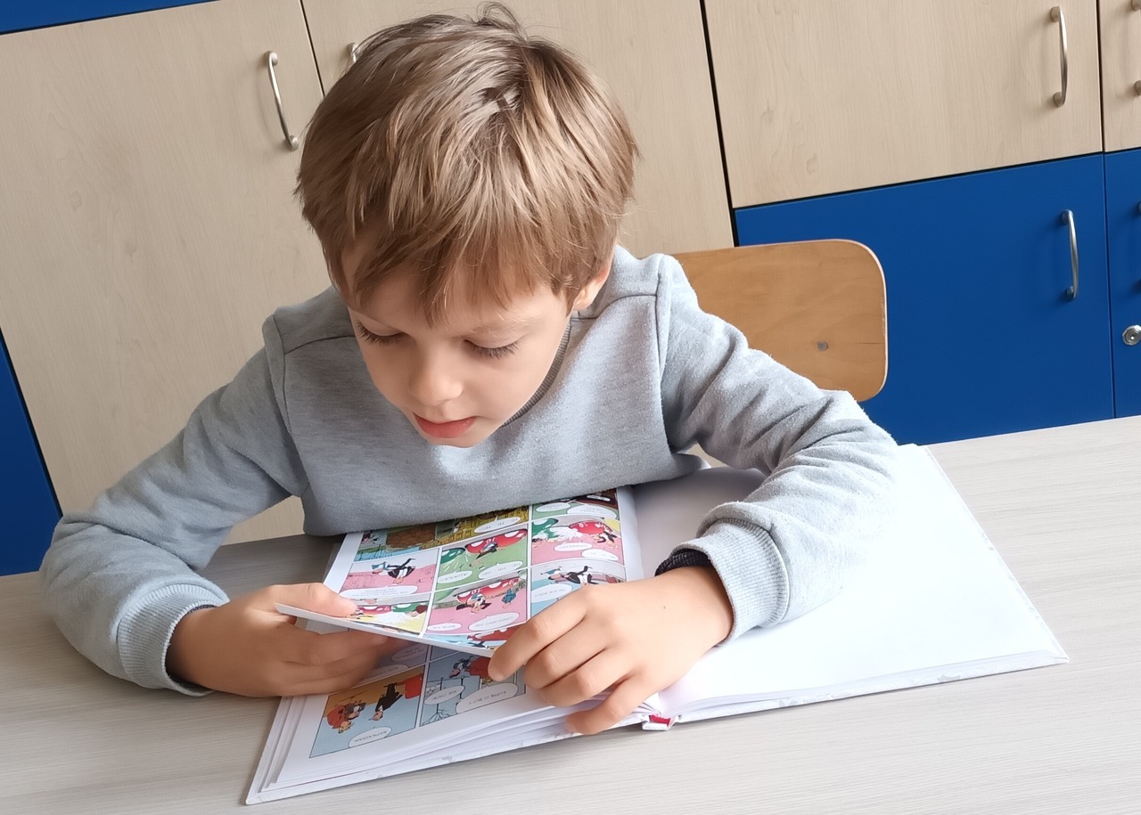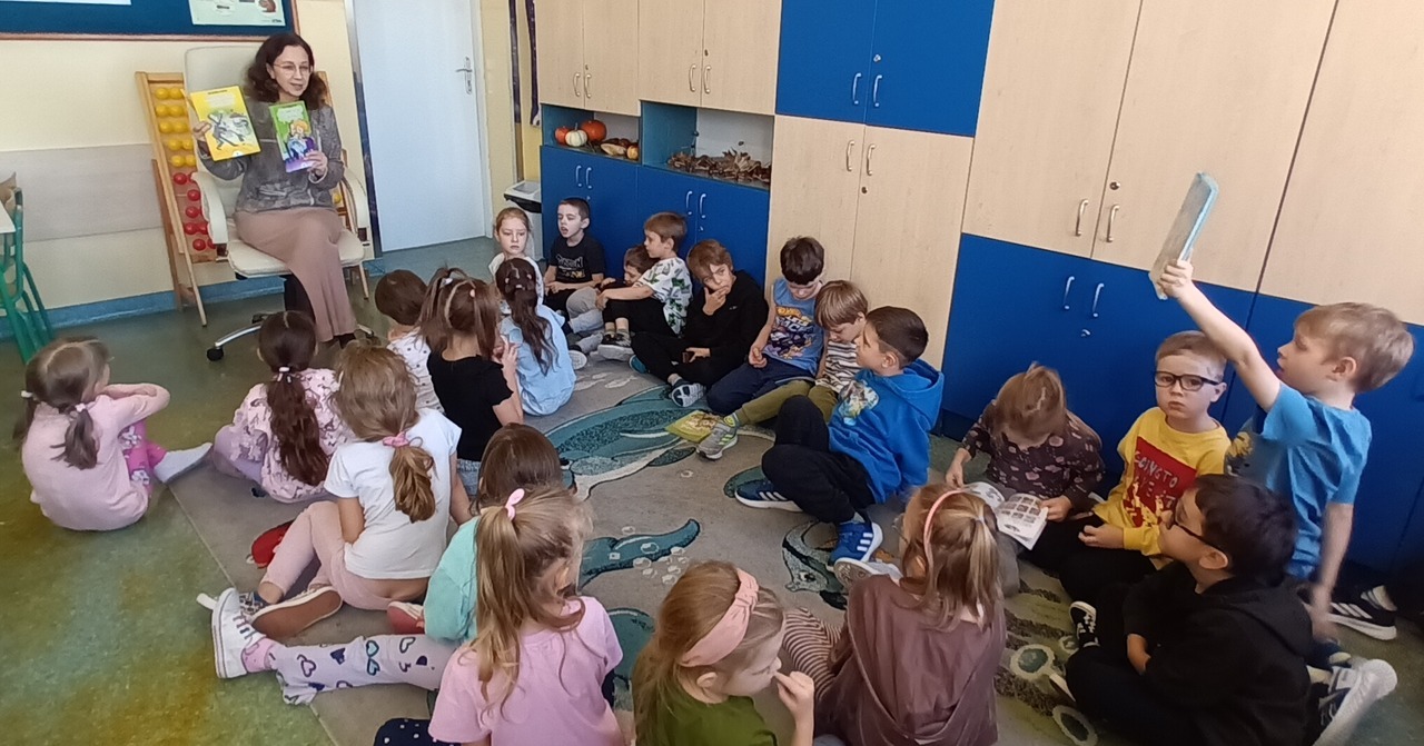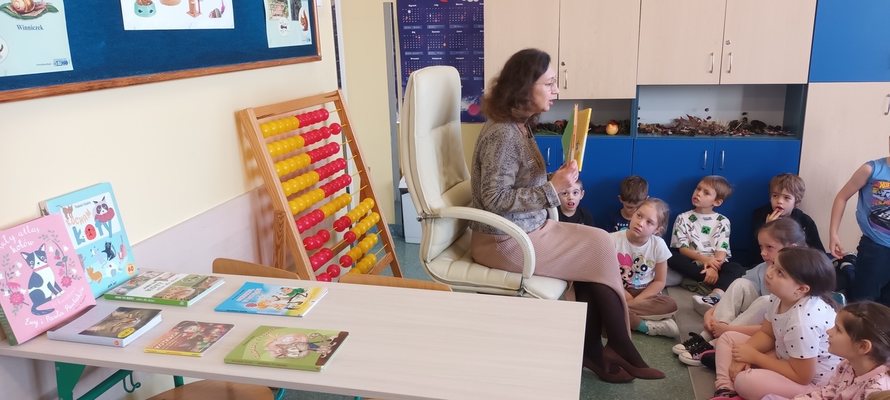 W kolejny dzień gościliśmy panią Basie, bibliotekarkę, która również odczytała fragment lektury, a następnie zachęcała uczniów do odwiedzenia biblioteki w celu wypożyczenia następnych części przygód bohatera lektury. Dzieci miały możliwość dowiedzieć się na czym polega praca bibliotekarza oraz zrozumieć dlaczego w takich miejscach jak czytelnia, należy zachować ciszę. Była to okazja do poznania zalet głośnego czytania, które rozwija wyobraźnię, wzbogaca słownictwo, poprawia pamięć i koncentrację, a przede wszystkim wprowadza w ciekawy świat literatury.