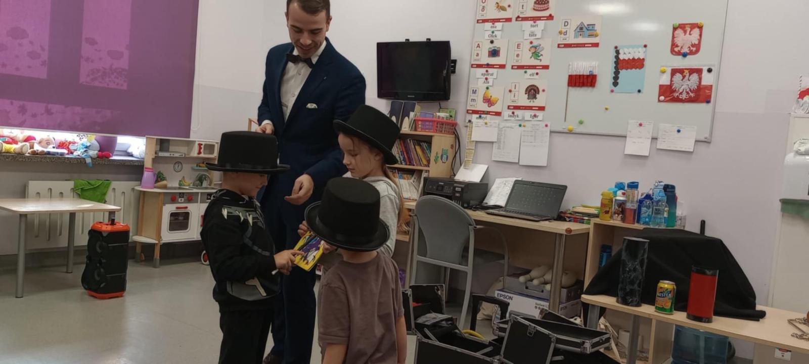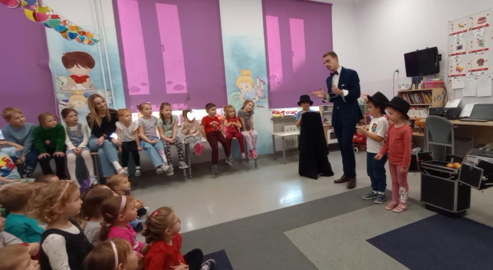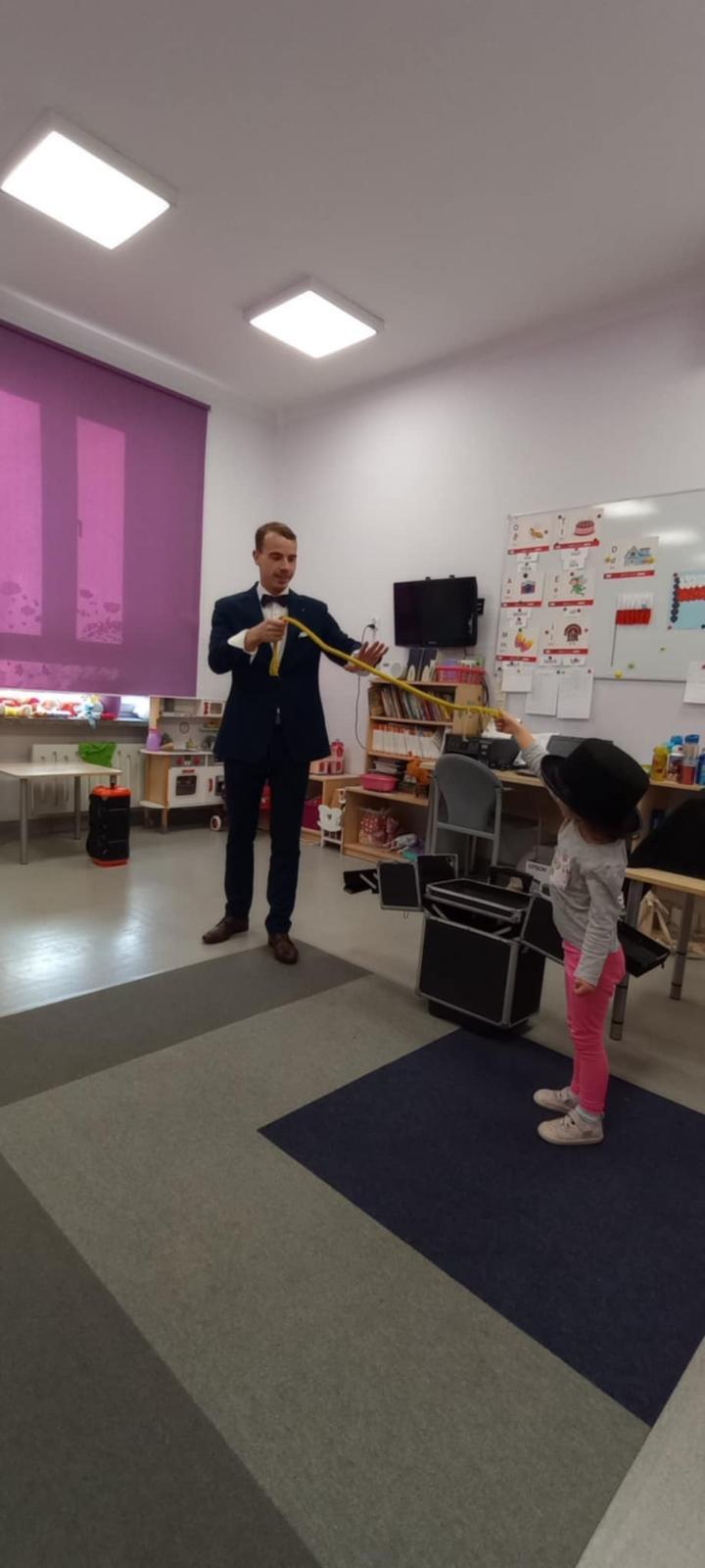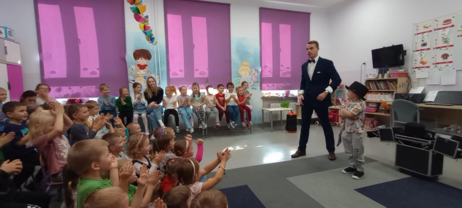 W dniu 04 listopada wszystkie przedszkolaki wzięły udział w pokazie Iluzjonisty z grupy Moccino. Dzieci były zachwycone sztuczkami przedstawionymi przez magika. Dzięki zaangażowaniu części przedszkolaków w występ pokaz stał się jeszcze ciekawszy. Wywołał u wszystkich dzieci wiele uśmiechu oraz momentów zachwytu.